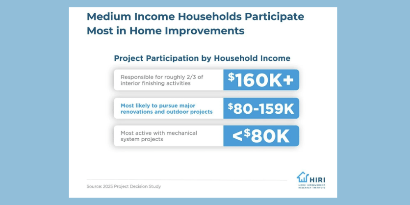 What are the magic numbers for opting to take on a home improvement project in 2026? About two-thirds of interior projects are done by households bringing in $160,000-plus, according to HIRI.  The study also found that medium-income households ($80,000 to $159,000) are the most likely to pursue major renovations and outdoor projects, while those households making less than $80,000 are the most active with mechanical system projects.