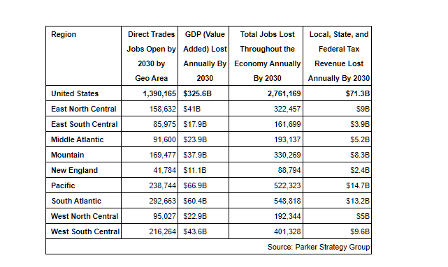 Parker Strategy Group, a national consulting firm, was secured by Bring Back the Trades to quantify the economic impact of the projected job deficit. Their analysis shows how the workforce shortage is creating ripple effects across industries using jobs data the University of New Hampshire pulled from Department of Labor sources.