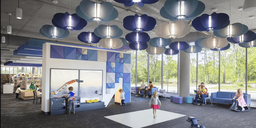 Above image: Acoustic Echo and Acoustic Static lighting fixtures in the Reynolds Branch of the Columbus Metropolitan Library in Columbus, OH (photo by Eric Piasecki/OTTO)