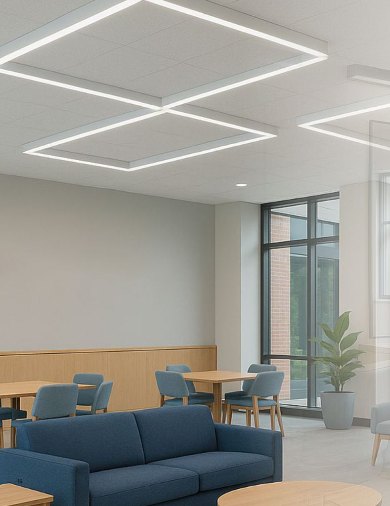 One of Momentum’s defining advantages is its expansive modularity, which allows installers to configure continuous runs, create geometric shapes, or adapt the system to architectural constraints. SATCO highlights “infinite shapes and configurations” as a core feature, supported by up/down light control and multiple mounting options, including surface, recessed, suspension, and wall mount kits.