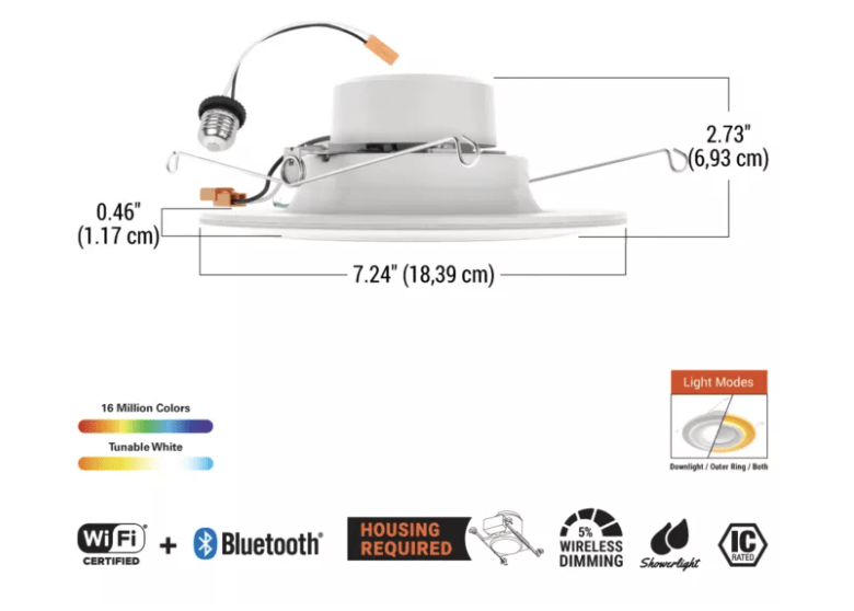 • Round 4” and 5”/6” Dual Zone Smart Wi-Fi LED Trims offer downlight and outer ring lighting and are compatible with most recessed housings