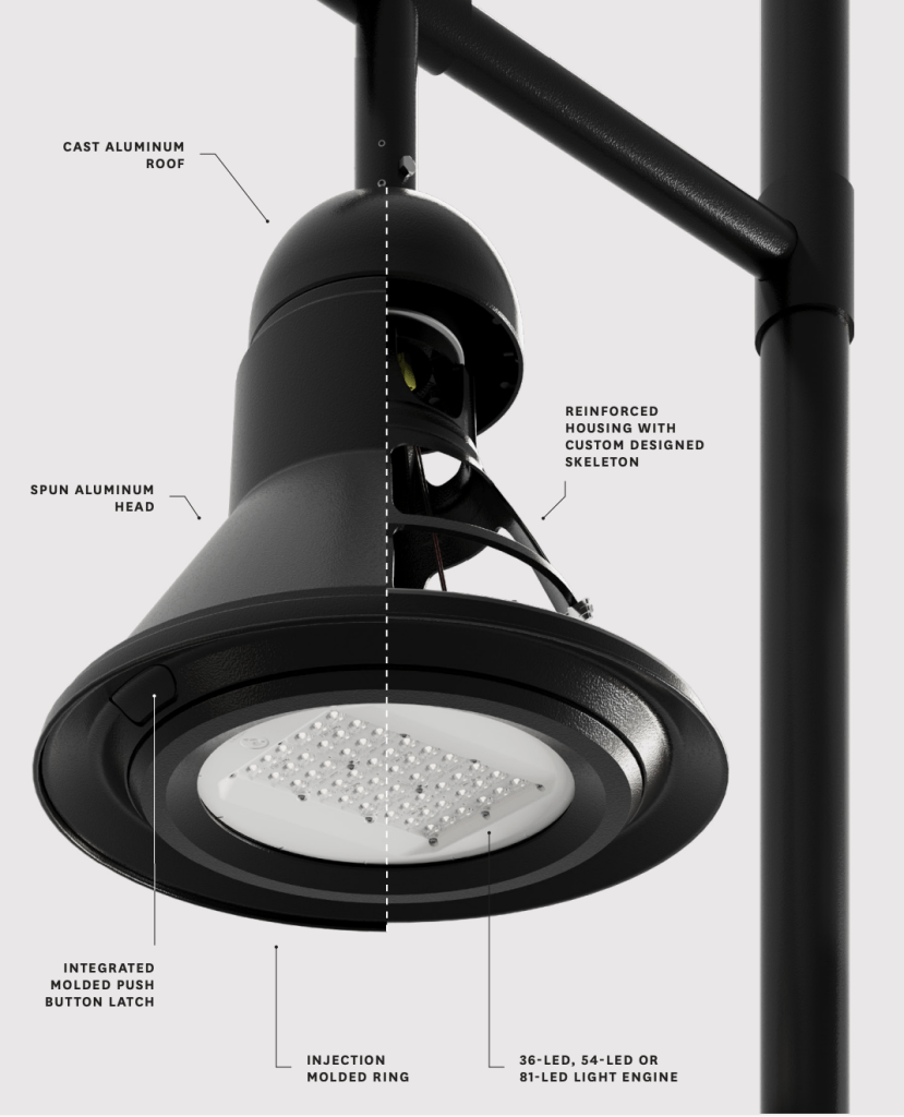 Campana continues to offer over 14 photometric distribution types. For further flexibility, the light engine’s optics can be oriented in 90° increments up to 180°; two distribution types can be combined within a single light engine. City planners can therefore illuminate a roadway and an adjacent sidewalk or bike path with a single luminaire, contributing to project savings.