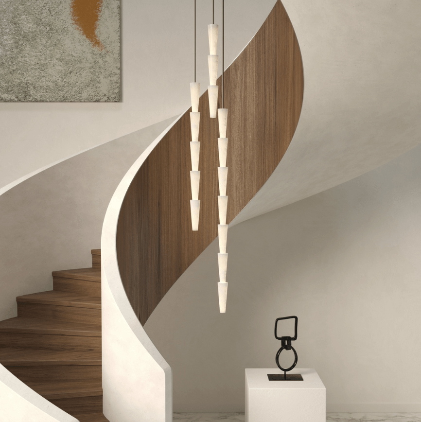 Crafted from alabaster, a material prized for its translucence and natural veining, every Cascade light is unique. The interplay of stone and light transforms each cone into a glowing vessel, balancing elegance with elemental simplicity.